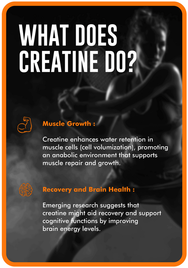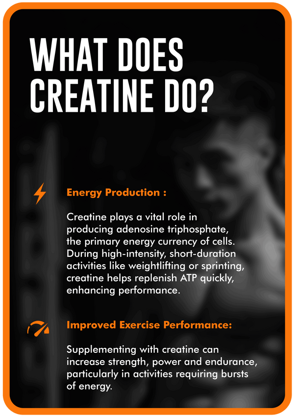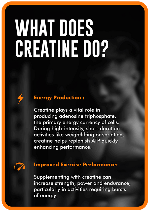 Creatine is a natural substance that turns into creatine phosphate in the body. Creatine phosphate helps make a substance called Adenosine Triphosphate (ATP). ATP provides the energy for muscle contraction. It is the most effective sports supplement for improving exercise performance and gaining lean muscle mass.