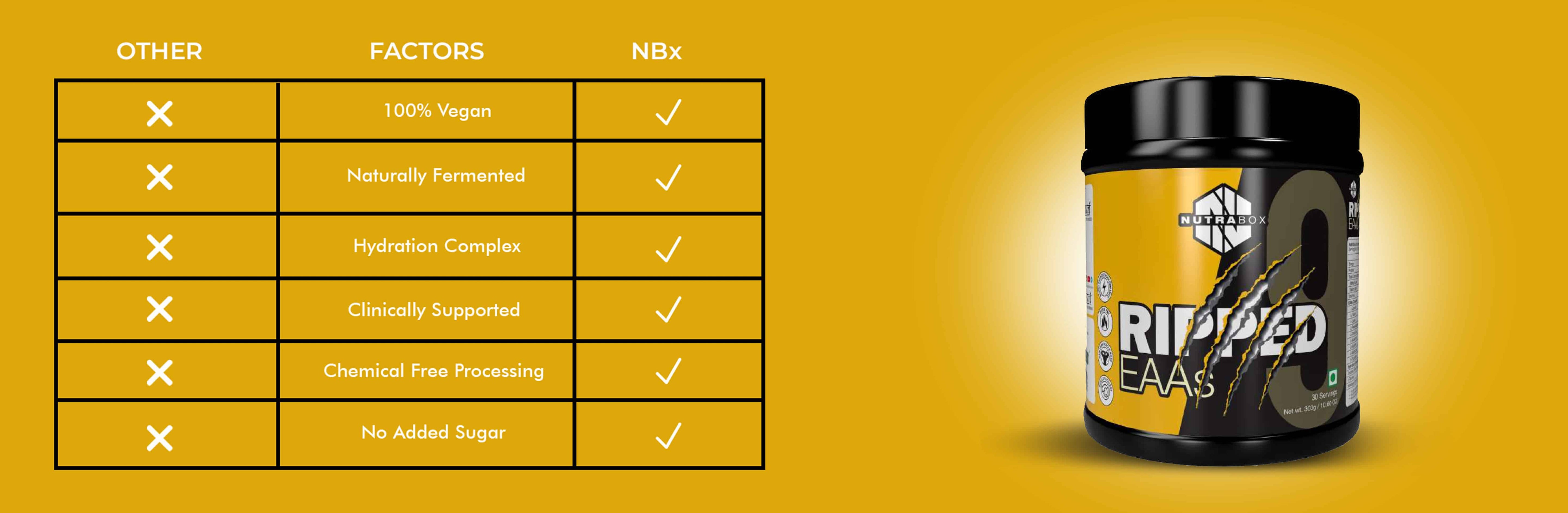 In our Nutrabox Ripped EAA formula process, no harsh chemical solvents are used, and the purity is not compromised. Our unique hydration complex formula in Ripped EAA helps maximize physical performance and increases energy levels.