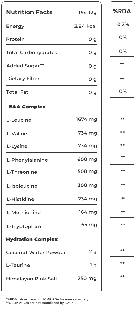 The Hydration Complex (coconut water powder, L-taurine, Himalayan pink salt) helps restore electrolytes, boost hydration, support muscle function, and prevent fatigue and cramps during and after physical exertion.