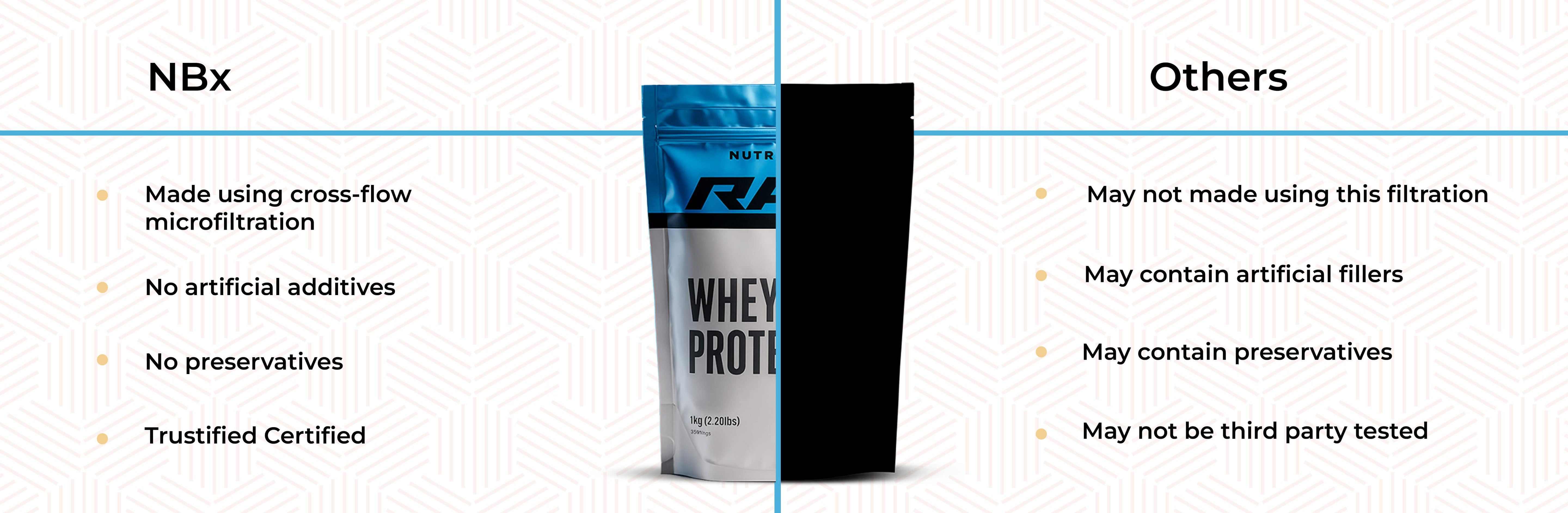 Nutrabox Raw whey protein is derived using Cross-Flow Microfiltration (CFM) technology, which is the best in the industry. This method ensures the highest purity and quality by maintaining the protein's natural structure and nutrient content.