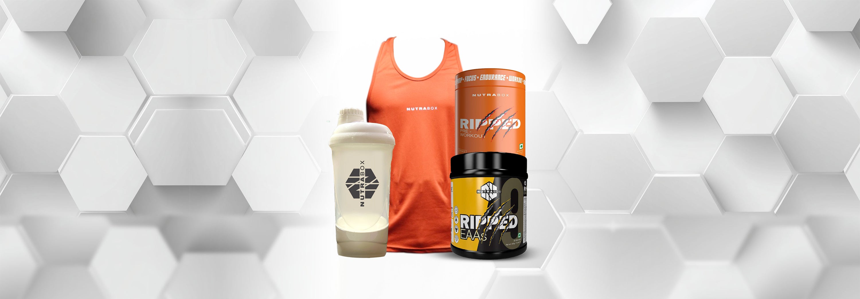 The Ripped Workout Combo offers Nutrabox Ripped Pre-Workout, Ripped EAA, Nutrabox ripped T-Shirt and a free red shaker.