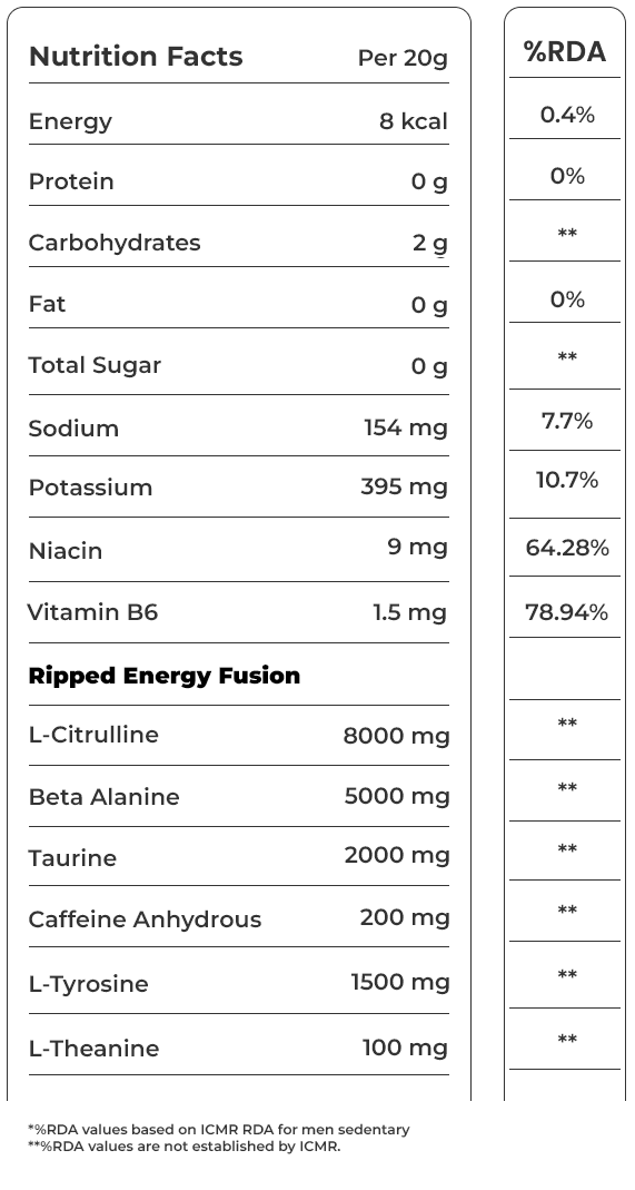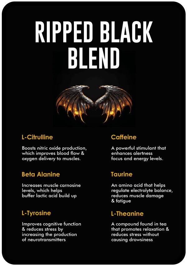 Nutrabox Ripped Pre-Workout Black edition has Ripped energy fusion which includes blend of Citrulline , Beta-Alanine, Taurine, L-Tyrosine, Caffeine and L-theanine.