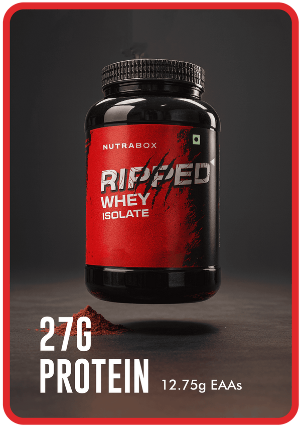 Post Workout: Nutrabox Ripped Isolate Whey Protein: It gives exceptional Purity, Recovery & Absorption. It gives 27 grams of pure isolate whey protein per serving with added Glutamine and EAAs. It is low in carbs and High in protein. Ripped Whey Isolate completes your diet by preserving the consumption of protein and provides the muscles with protein to give them bulk.