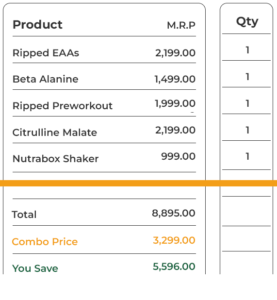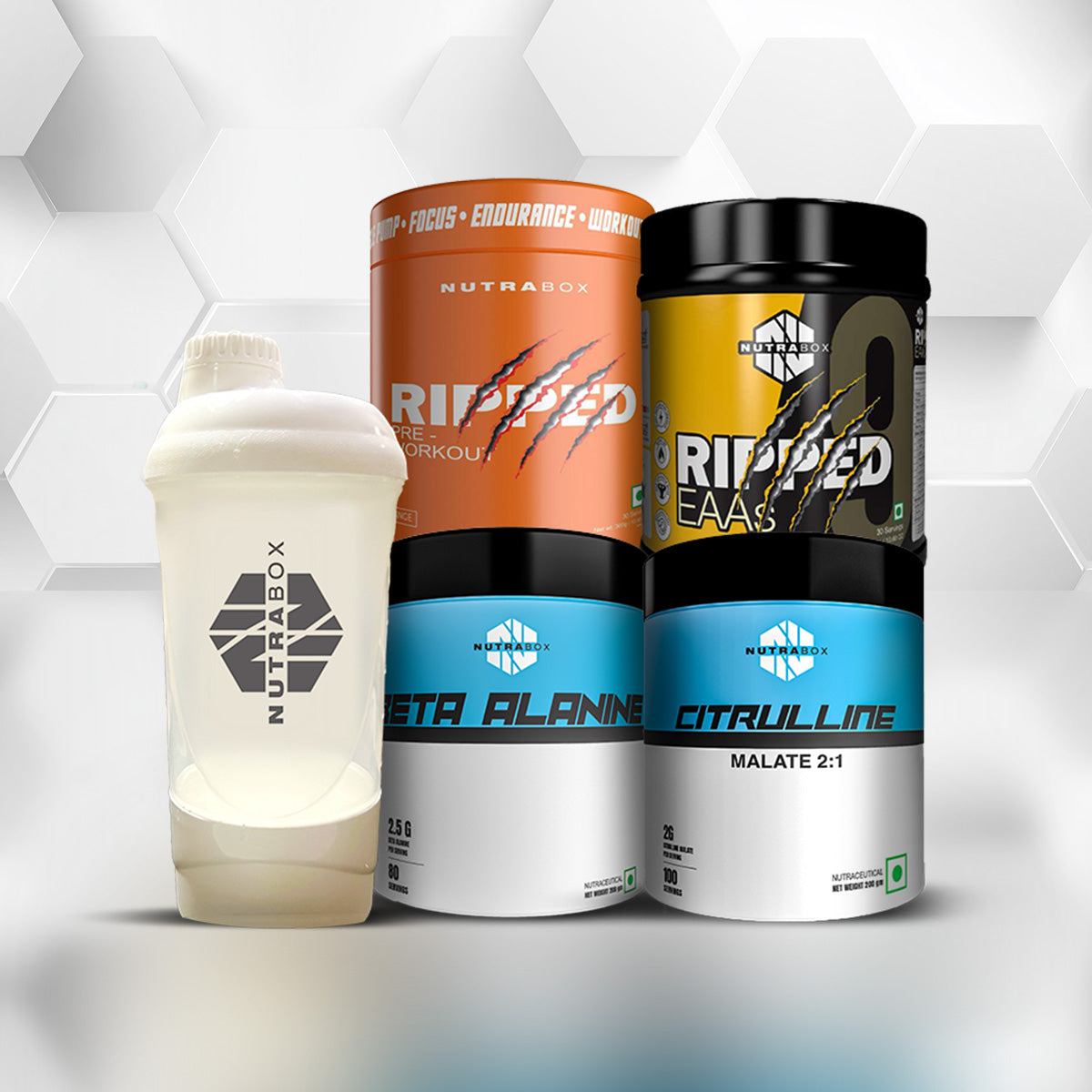 Take your workout to the next level with our pre and intra workout drinks. The combo consists of Ripped Pre-workout, Ripped EAAs, Citrulline Malate, Beta Alanine and a Shaker.